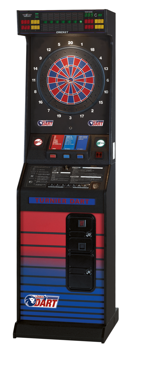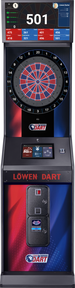 Für die Gastronomie bietet er CE- und GS-Zertifizierung, Dataprint-Schnittstelle, Münzprüfer, Banknotenleser und optional die LÖWEN-DART-App für Spielerprofile, Statistiken und Online-Updates.