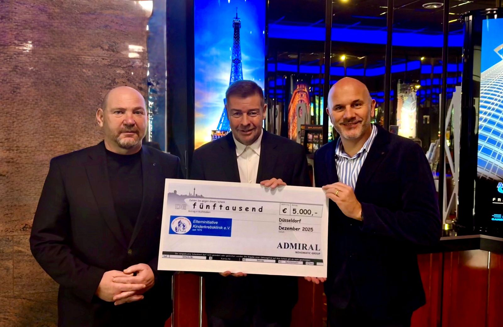 Auch in diesem Jahr setzt die Admiral Play GmbH das langjährige Engagement fort und spendet 5.000 € an die Elterninitiative Kinderkrebsklinik e.V. in Düsseldorf. Mit der jährlich gleichbleibenden Unterstützung unterstreicht das Unternehmen seine langjährige Verbundenheit. Bei der Scheckübergabe am Mittwoch, den 10. Dezember 2025 waren die Geschäftsführer Boris Kuzenko und Martin Moßbrucker sowie Frank Fleßer, der Spendenbetreuer der Elterninitiative, in Düsseldorf vor Ort. Die Elterninitiative Kinderkrebsklinik ist ein gemeinnütziger Verein, der sich seit mittlerweile 46 Jahren für krebskranke Kinder und Jugendliche einsetzt. Der Verein unterstützt und fördert die diagnostische und therapeutische Behandlung von krebskranken und chronisch kranken Kindern am Universitätsklinikum Düsseldorf. Zu den Maßnahmen gehören auch jährliche Freizeiten, Reit- und Musiktherapien, Kinderkochen, Clownbesuche, Spiel- und Sportangebote sowie Ausflüge.